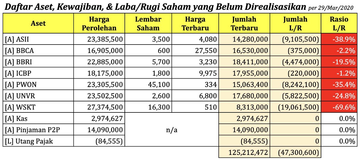 Sementara itu, sejak awal tahun 2020 ini harga saham anjlok cukup signifikan akibat merebaknya virus SARS-CoV-2 yang menyebabkan pandemik penyakit COVID-19. Saham-saham yang kami miliki pun turun cukup dalam, dengan total rugi yang belum direalisasikan (Unrealized Loss) sebesar Rp -47,300,600. Berikut rinciannya :