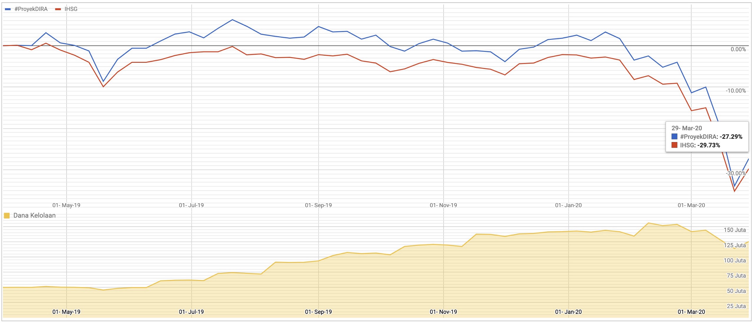 Dihitung sejak kami memulai #ProyekDIRA ini (awal April/2019), performa overall portofolio kami turun -27.29%, sedikit unggul di atas IHSG yang turun -29.73% pada periode yang sama.