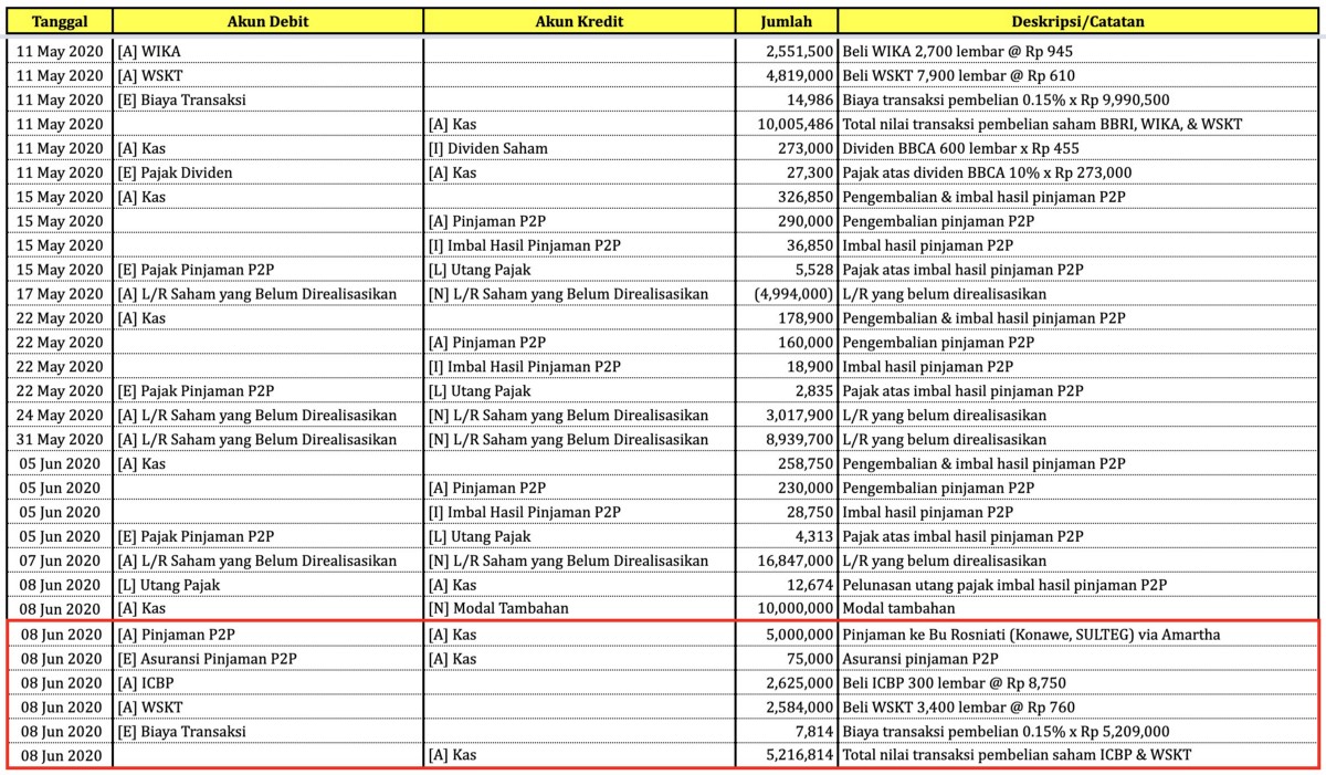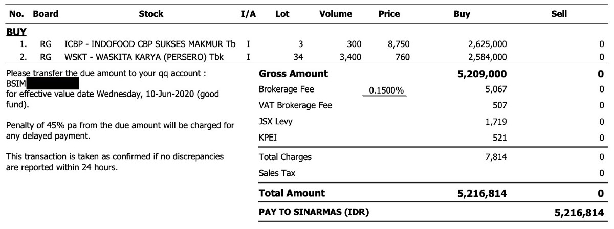 - 3,400 lembar saham WSKT pada harga Rp 760 (total Rp 2,584,000).