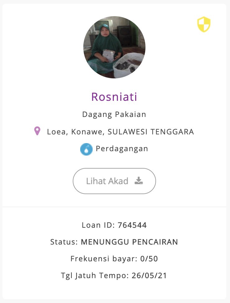 - Penyaluran pinjaman P2P kepada Bu Rosniati di Konawe, Sulawesi Tenggara sebesar Rp 5,000,000. Status pinjaman saat ini sedang menunggu pencairan.