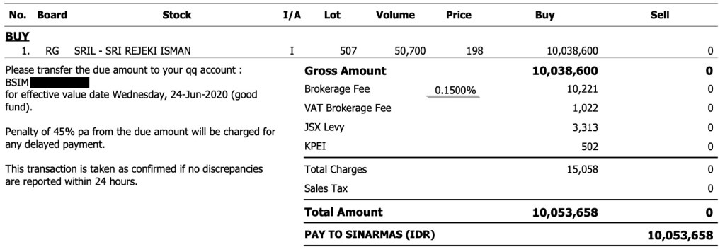 - 50,700 lembar saham SRIL pada harga Rp 198 (total Rp 10,038,600)