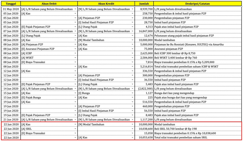 Berikut Catatan Transaksi yang telah diperbaharui dengan data transaksi pembelian saham di atas.