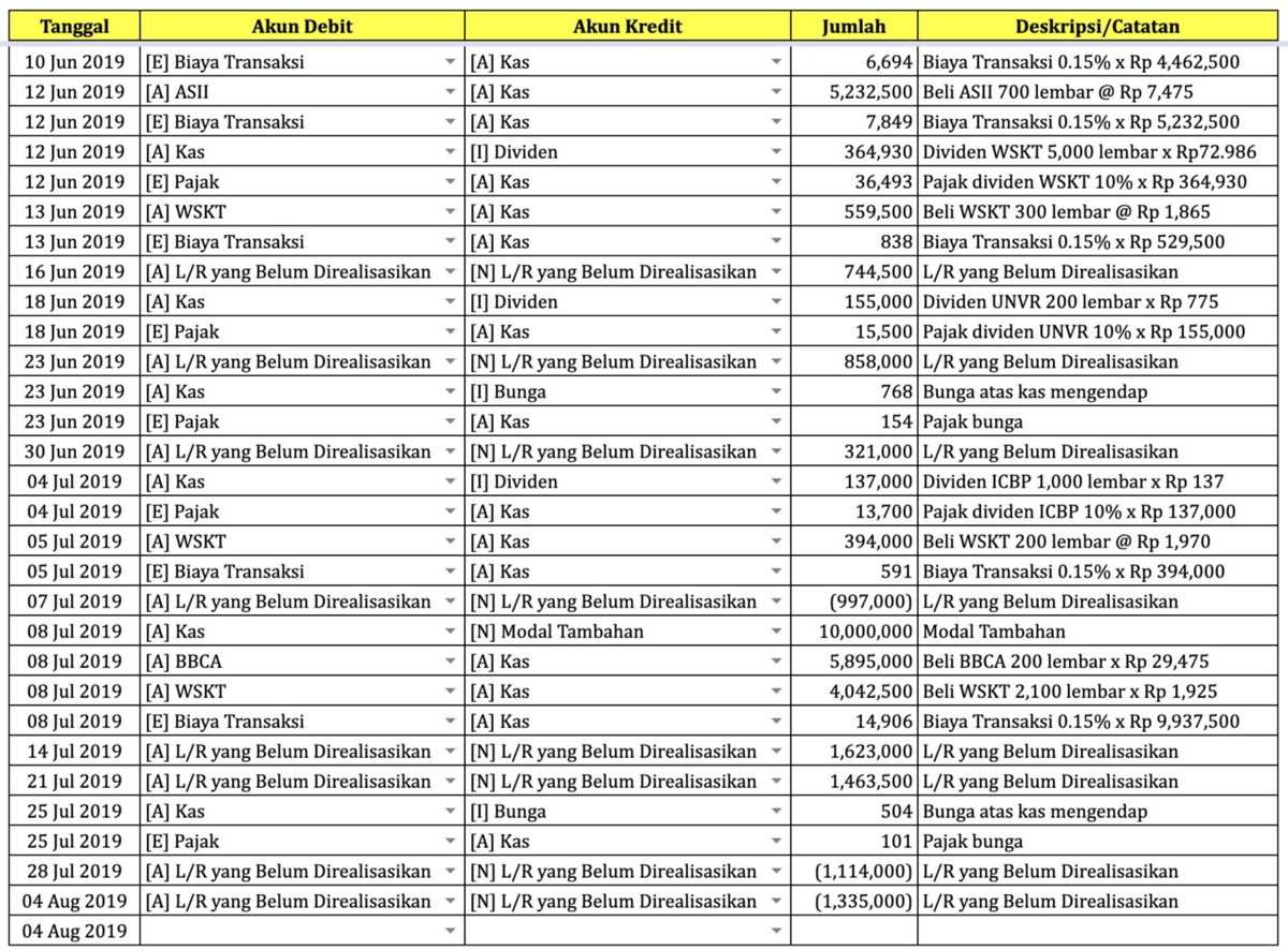 Hari Selasa (06 Agustus 2019) kemarin, kami menyuntikkan modal tambahan dari sisa gaji kami sebesar Rp 20,000,000. Memanfaatkan kondisi bursa saham yang sedang melemah, kas tersebut langsung kami manfaatkan untuk membeli saham sebagai berikut :
