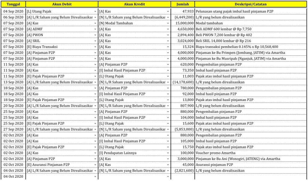 Sebelum melaporkan posisi portofolio #ProyekDIRA, kami ingin menyampaikan terlebih dahulu bahwa hari Jumat tanggal 2 Oktober kemarin, kami telah menyalurkan pinjaman P2P sebesar Rp 3,000,000 ke Bu Ani di Wonogiri, Jawa Tengah via Amartha. Pada transaksi tersebut, kami mendapatkan voucher promo dari Amartha sebesar Rp 100,000, dan dikenakan biaya asuransi sebesar Rp 45,000. Status pinjaman saat ini sedang menunggu pencairan.