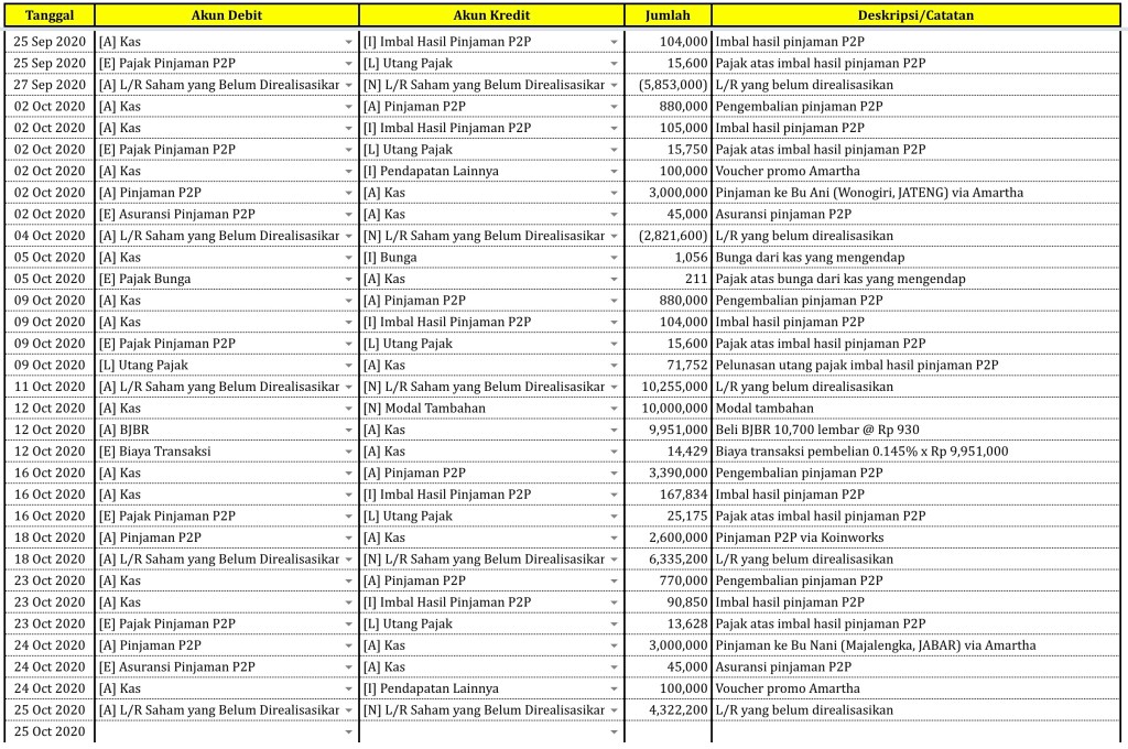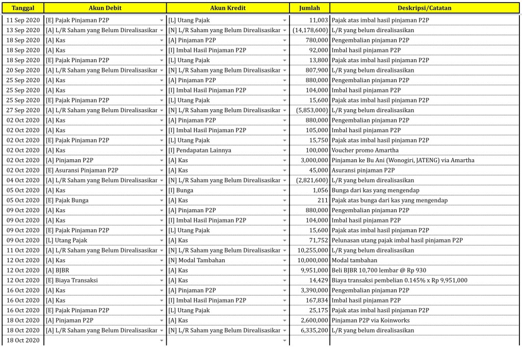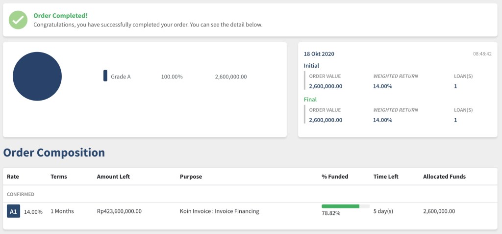 Sebelum melaporkan kondisi portofolio, kami ingin menyampaikan terlebih dahulu transaksi penyaluran pinjaman P2P via Koinworks yang kami lakukan hari Minggu, 18 Oktober 2020 sebesar Rp 2,600,000.