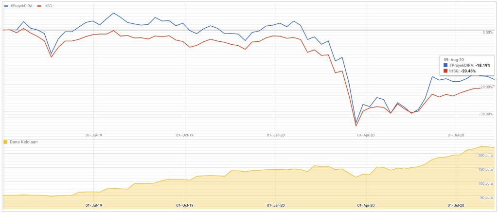 Perbandingan Performa Historis #ProyekDIRA vs IHSG sampai tanggal 9 Agustus 2020