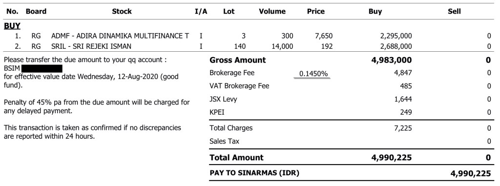 • 14,000 lembar saham SRIL pada harga Rp 192 (total Rp 2,688,000)