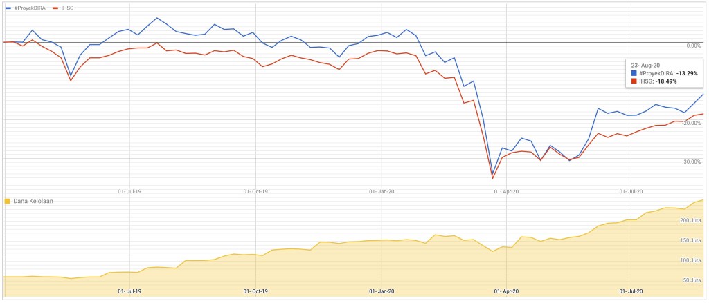 Perbandingan Performa Historis #ProyekDIRA vs IHSG sampai tanggal 23 Agustus 2020
