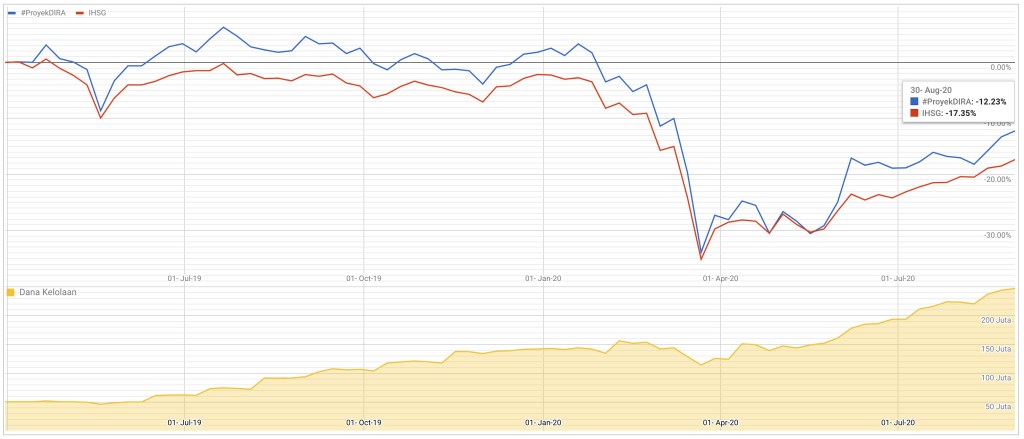 Perbandingan Performa Historis #ProyekDIRA vs IHSG sampai tanggal 16 Agustus 2020