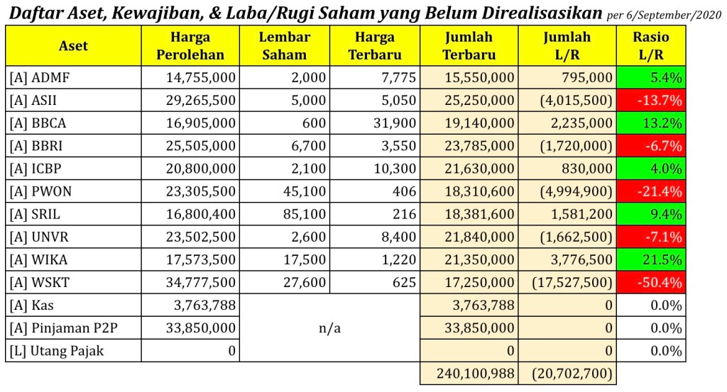 Daftar Aset, Kewajiban, & Laba/Rugi Saham yang Belum Direalisasikan per tanggal 6 September 2020
