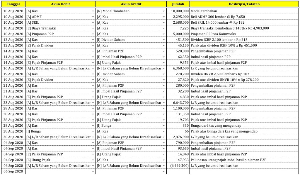 Berikut Catatan Transaksi yang telah diperbaharui dengan data transaksi pembelian saham di atas.