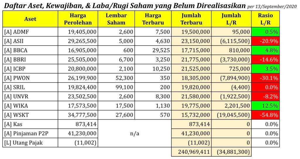 Daftar Aset, Kewajiban, & Laba/Rugi Saham yang Belum Direalisasikan per tanggal 13 September 2020
